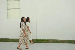 Lois and India at the piano. The piano is in the foreground and you can see them behind it.